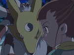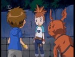 Renamon and Guilmon fight and Ruki is pleased to see Renamon is winning. However, the Digimon struggles before striking the final blow to defeat Guilmon because she could hurt Takato too.