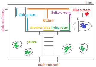 I'll show you why I think Rika's house looks like this. Let's start with the garden (the green coloured things in the garden are trees xD).
